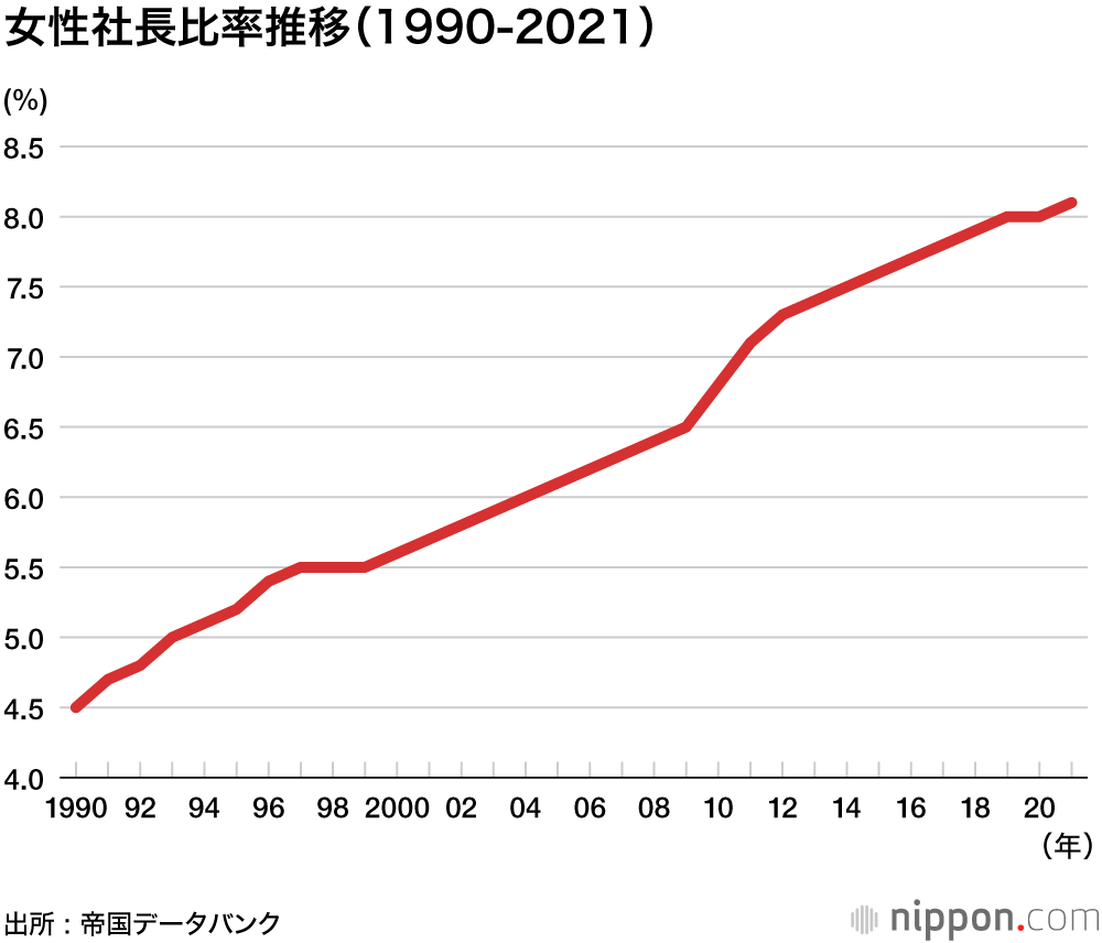 帝国データバンクが全国約117万社の事業会社を対象とした分析で、2021年4月末時点の日本の女性社長比率は前年0.1%増の8.1%となった。1990年の3.5ポイントから緩やかに上昇が続いているが、依然として女性社長の占める割合は1割を下回る。