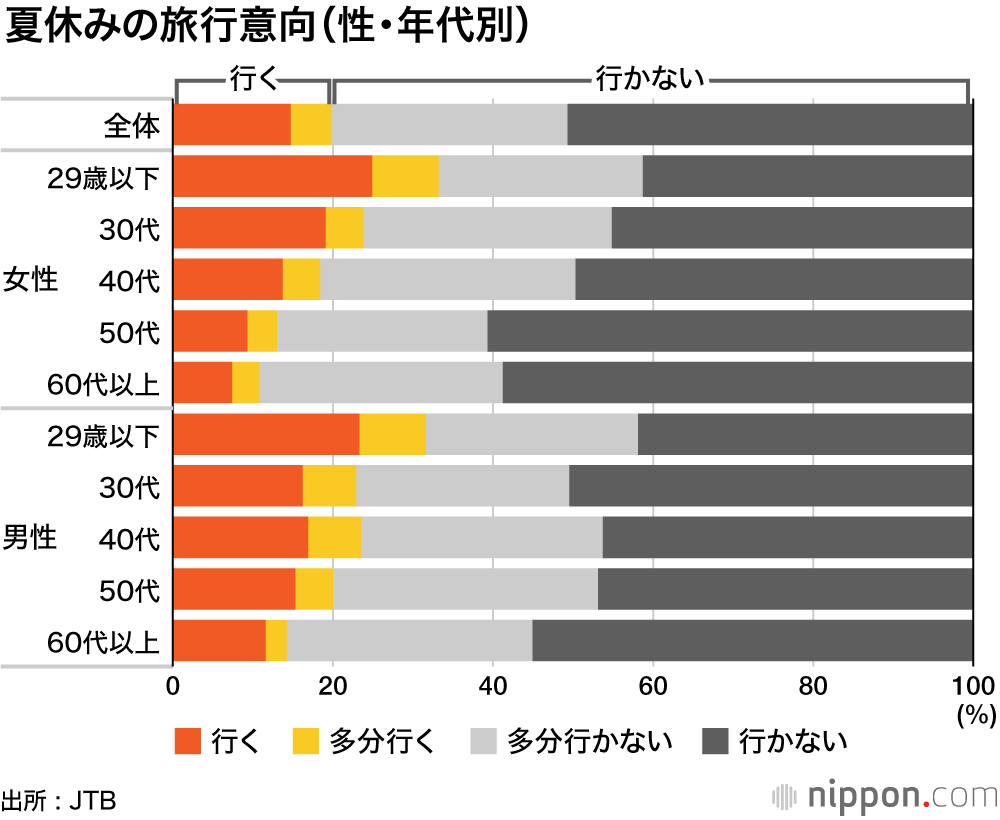 アンケート調査で期間中に旅行にいくかどうか聞いたところ、「行く」「多分行く」の合計が19.8%。性年代別では、女性・男性ともに若い世代ほど旅行意向が強く、「29歳以下」は女性33.2%、男性31.6%。一方、60歳以上では女性10.8%、男性14.2%。
