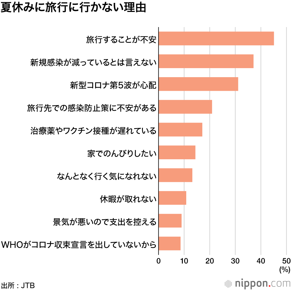 旅行に行かない理由としては、「旅行することが不安」「新規感染が減っているとは思えない」などコロナに対する警戒感が大きく影響している。JTBでは「ワクチン接種が進むことで旅行意識が高まることが考えられる」と期待を込めた分析をしている。