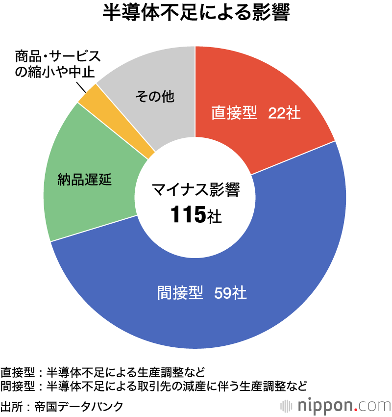 自動車産業など製造業を中心に半導体不足の影響が広がっている。帝国データバンクの調査で、2021年度以降で、半導体不足によって直接的・間接的に生産調整などに追い込まれた81社を含め、生産や商品・サービス供給面でマイナスの影響が判明した上場企業は115社にのぼった。