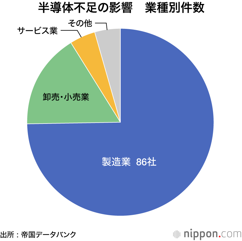業種別にみると、最も多いのは製造業の86社。中でも、自動車部品や自動車製造のほか、金属プレス製品や自動車駆動装置など自動車関連産業での影響が目立った。半導体不足による国内外の自動車メーカーの減産により、生産調整に追い込まれたケースが多いという。スマートフォン向け部品、家電製品、ゲーム機などエレクトロニクス産業も大きく影響を受けた。