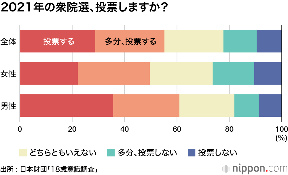 任期満了か、解散かのいずれにしろ、衆院選が迫っている。日本財団が8月中旬に実施した「18歳意識調査」で、衆院選で「投票する」「多分投票する」を合わせて55.2%で、前回衆院選(2017年)の18-19歳の投票率40.49%を大きく上回った。投票意向のある男性は6割を超えた。