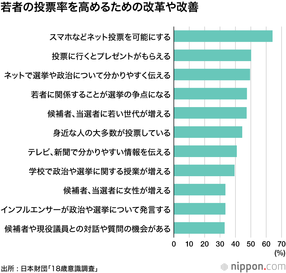 若者の投票率を高めるための改革や改善策としては、「スマートフォンなどでのインターネット投票を可能にする」64.1%が最も多かった。また、「若者に関係することが選挙の争点になる」47.5%、「候補者、当選者に若い世代が増える」47.3%など、「自分ごと」と感じるためのきっかけを求めているようだ。