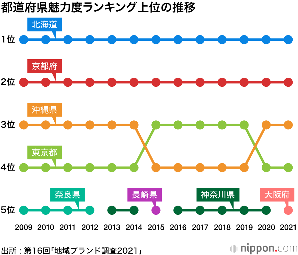 民間調査会社ブランド総合研究所の「地域ブランド調査2021」で、全国で最も魅力的な都道府県は北海道だった。都道府県が調査対象となった09年から13年連続で1位。「観光意欲度」「(地域産品の)食品想起率」でもトップだった。2位は13年連続で京都府。トップ10圏外だった長崎県が8位に浮上、神奈川県が5位から6位に順位を落とすなど、一部で順位に変動はあったが、トップ10の顔ぶれはほぼ同じ。(10位は同ポイントで2県のため、トップ10には11自治体がランクイン)