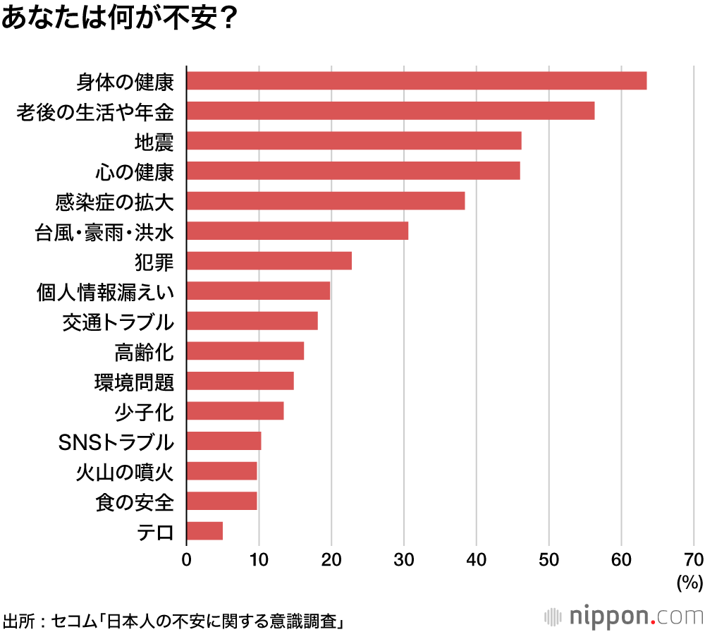 犯罪やトラブルに巻き込まれる不安よりも、健康や自然災害への不安が大きく上回るのは、日本の治安の良さゆえか。