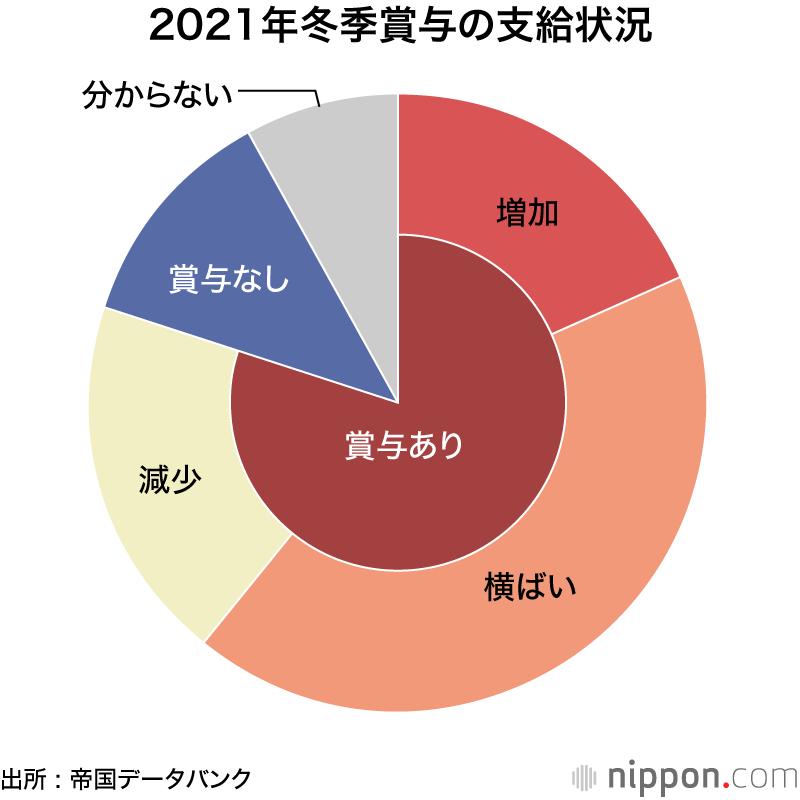 帝国データバンクが2021年11月に全国の2万3679社を対象に実施した調査(有効回答は1万1504社)で、2年にわたるコロナ禍の中でも、2021年の冬季賞与(ボーナス、一時金、寸志などを含む)が「あり」と回答した企業が全体の80.3%に上った。