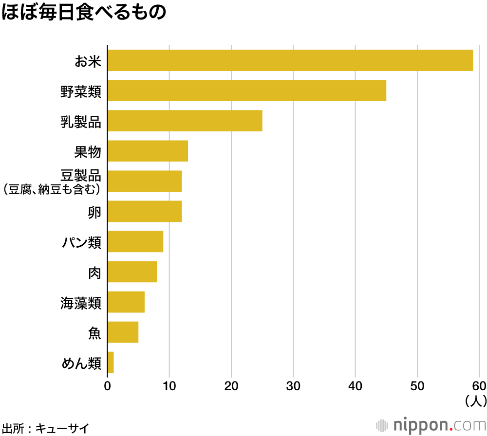 元気な100歳が普段の食事でほぼ毎日食べるものは、「お米」 59人、 「野菜」 45人、 「乳製品」25人がトップ3。エネルギー源の米、ビタミン・ミネラルを豊富に含む野菜、骨や歯をつくるカルシウムを摂取できる乳製品と、身体に必要なものを取り込む習慣がある人が多い。
