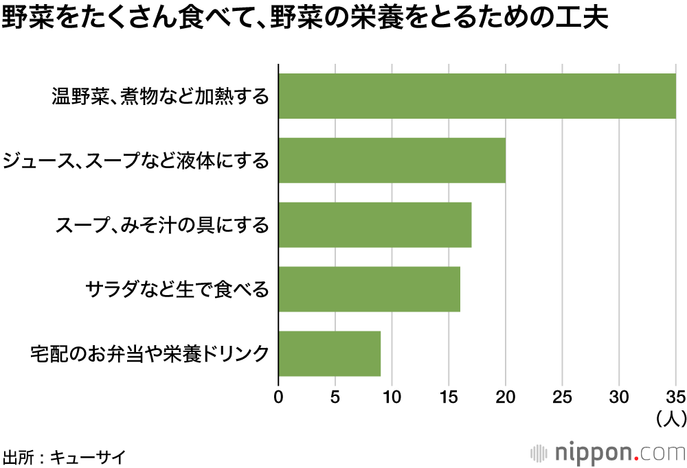 野菜をたくさん食べるために、温野菜や煮物など加熱して噛みやすくしたり、ジュース・スープなど液体にしている人も多い。