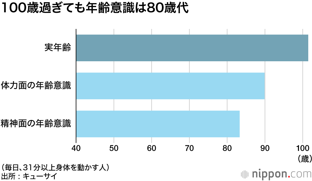 調査した100人の実年齢の平均は101.45歳。自分が何歳くらいだと感じているかの年齢意識を聞いたところ、行動や作業などで1日に31分以上身体を動かす人については、「体力面」で89.9歳、「精神面」で83.3歳と、実年齢より10歳以上若く感じていることが分かった。