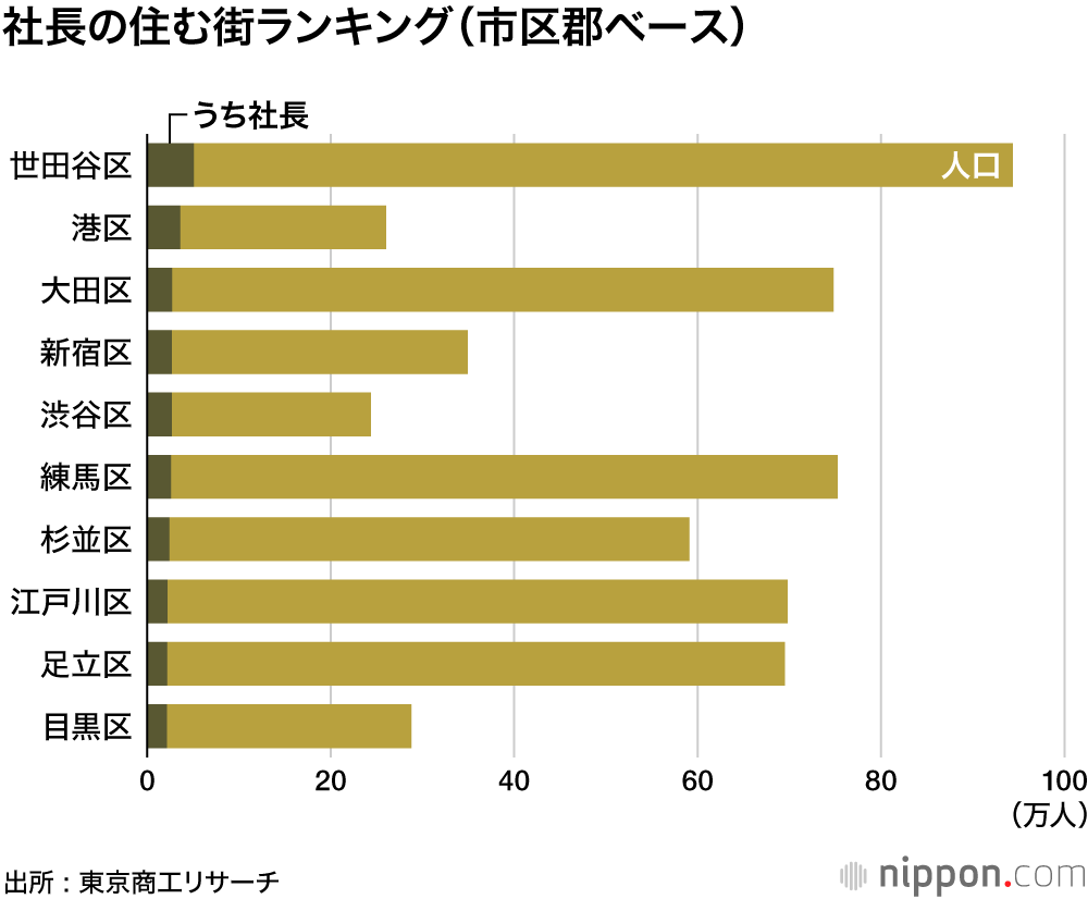 2位の港区は3万6087人で、人口に対する社長比率が13.8%で、区民の7人に1人が社長という “社長だらけ” エリア。これだれ多いと、定食屋で隣に座っている人も「もしかしたら、社長かも?」と思ってしまうが、港区の昼間人口は94万人超(2015年国勢調査)と、住民票上の区民の4倍もいるので、現実的にはそれほど頻繁に社長に出くわすわけではない。