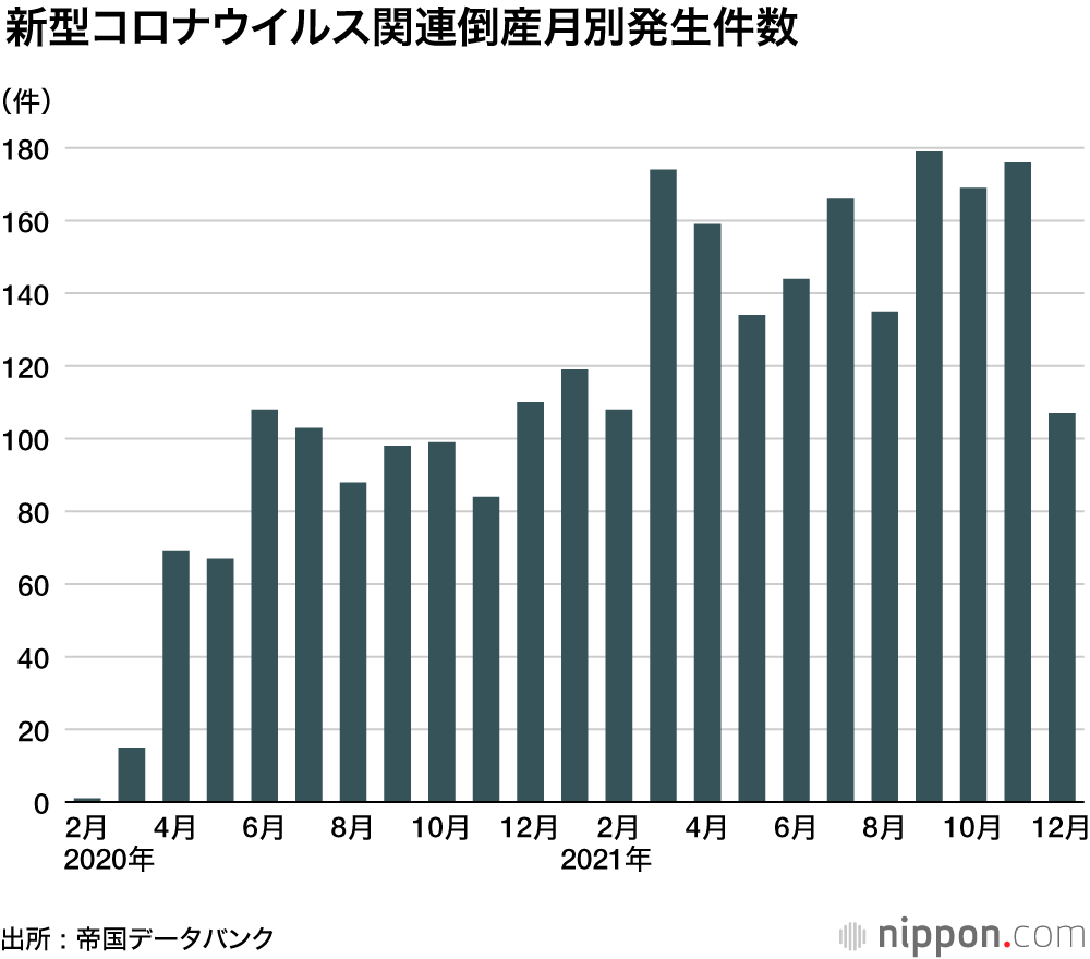 帝国データバンクのまとめで、新型コロナウイルスの影響を受けた倒産は2021年12月29日時点で全国で2612件(法的整理2426件、事業停止186件)となった。そのうち、2021年に発生したのは1770件で、20年(842件)の2.1倍だった。