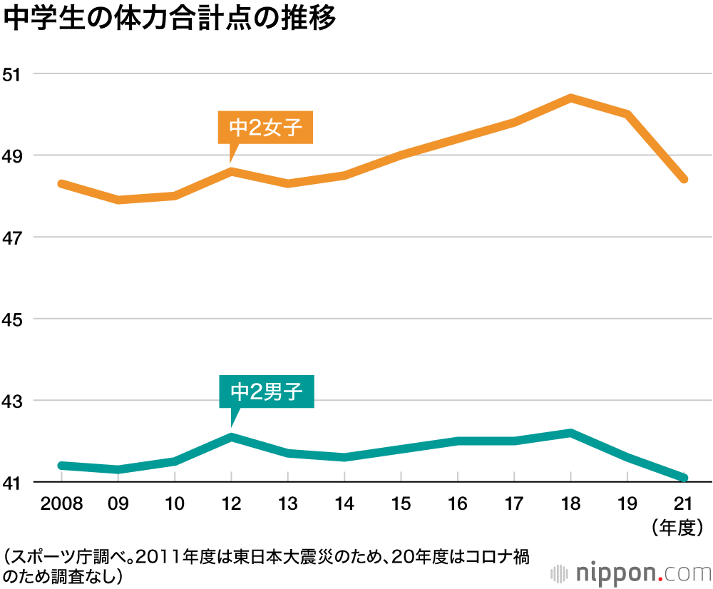 スポーツ庁が公表した全国の小中学生を対象とする2021年度の「全国体力・運動能力、運動習慣等調査」の結果によると、19年度の前回調査と比べて持久走や反復横跳びを含めた実技8種目の点数、回数やタイムなどの成績が軒並み低下し、体力合計点も男女ともに大きく下がった。新型コロナウイルス感染拡大の影響を受け、体力低下に拍車がかかった格好だ。