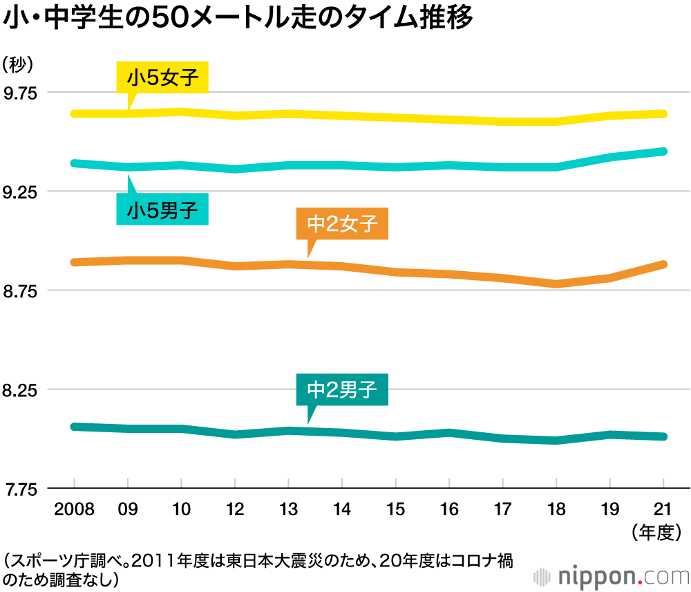 今回の調査は国公私立の小学5年と中学2年全員の約200万人を対象に、21年4月から7月にかけて行われた。種目は、握力、上体起こし、長座体前屈、反復横跳び、50メートル走、持久走(往復持久走)、立ち幅跳びと、ソフトボールまたはハンドボール投げの計8種目。2011年度と20年度は調査を中止している。