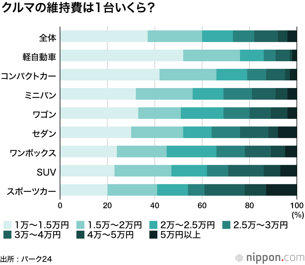 時間貸し駐車場、カーシェアなどのサービスを提供するパーク24が利用者を対象に実施したアンケート調査(有効回答3542人)で、クルマの月額の維持費は、「1万〜1.5万円」が最多34%、「1.5万~2万円」23%で、2万円以下が過半数を占めた。