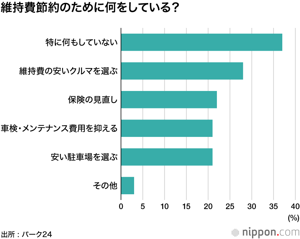 維持費の節約は「特に何もしていない」37%が最多で、「維持費の安いクルマを選ぶ」28%が続いた。
