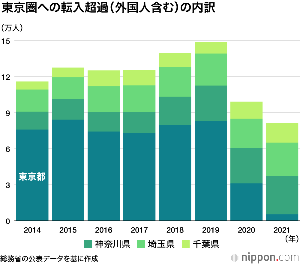 ただ、東京圏(東京、埼玉、千葉、神奈川)として見ても、コロナ禍以降、転入超過は鈍り、21年は前年より1万7544人少ない8万1699人となった。