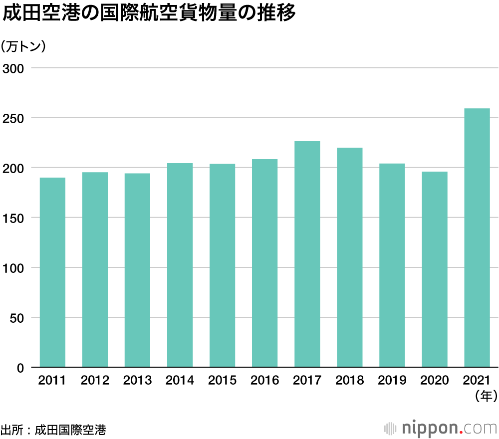 一方、国際航空貨物量は32%増の259万1255トンと過去最高を記録した。北米の自動車需要の回復で自動車部品に使用されるプラスチック類や世界的な半導体不足に伴う半導体製造装置の輸出が増加。輸入では新型コロナワクチンをはじめとする医薬品などの増加が寄与した。また、国際海上輸送の混乱で、従来は船便を使っていた貨物が一時的に航空輸送に流入したことも寄与した。