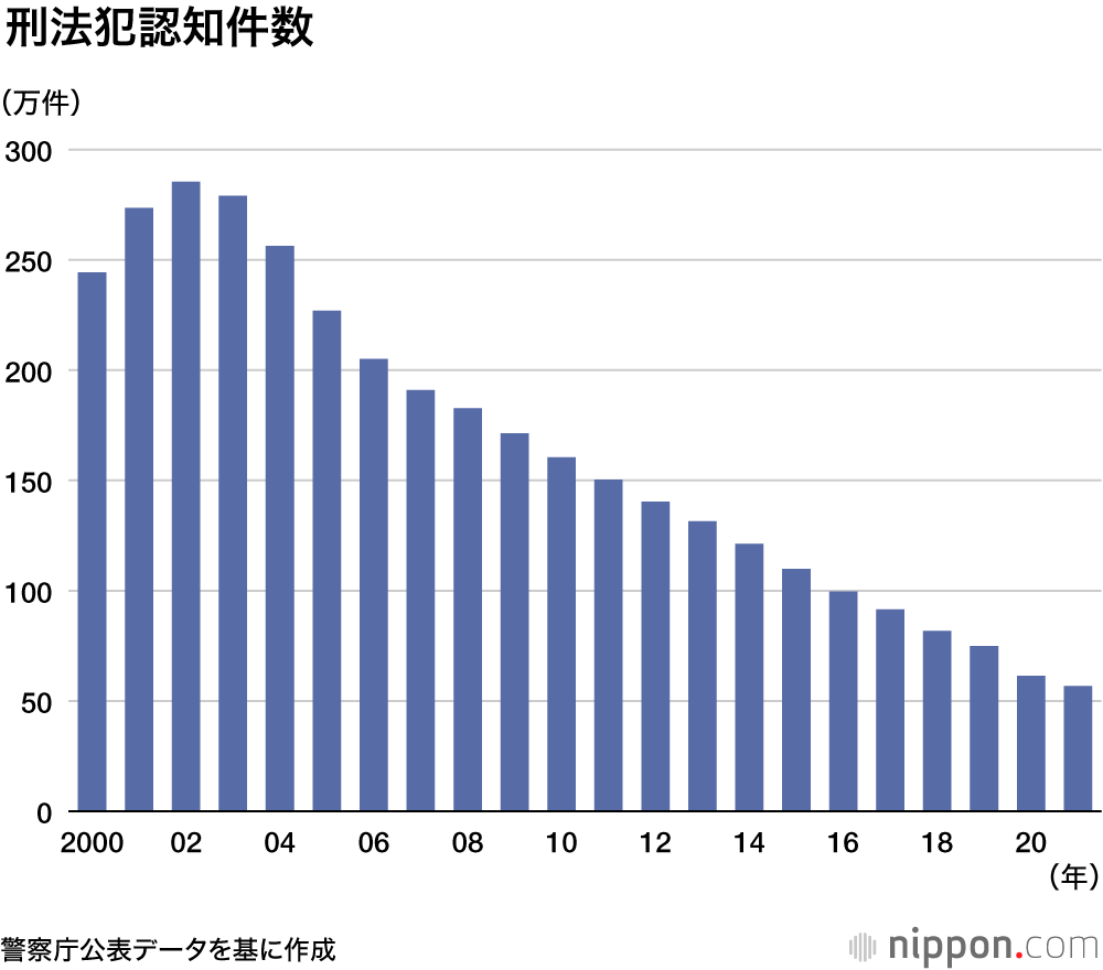 警察庁が公表した2021年の犯罪情勢まとめ(暫定値)によると、刑法犯は7.5%減の56万8148件で、7年連続で戦後最少を更新した。