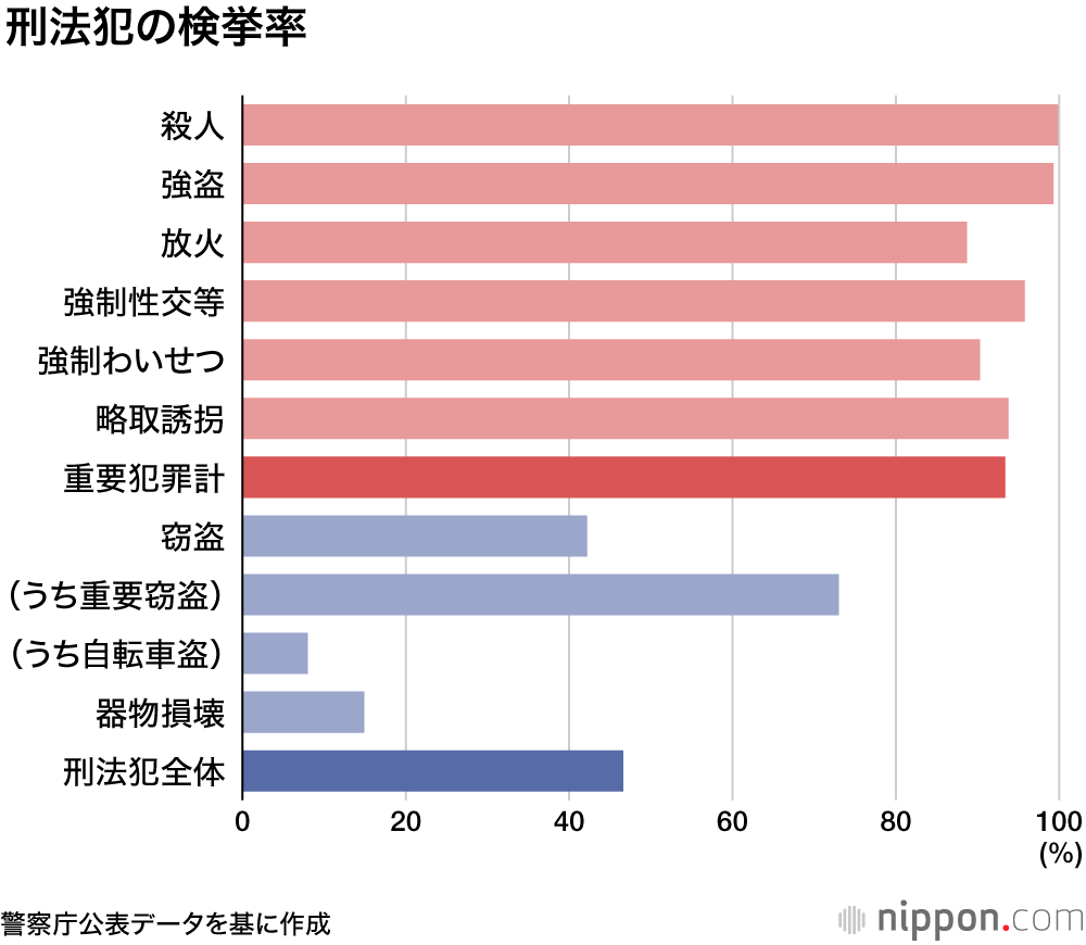 刑法犯の検挙率は46.6%。殺人・強盗などの「重要犯罪」については93.4%だった。