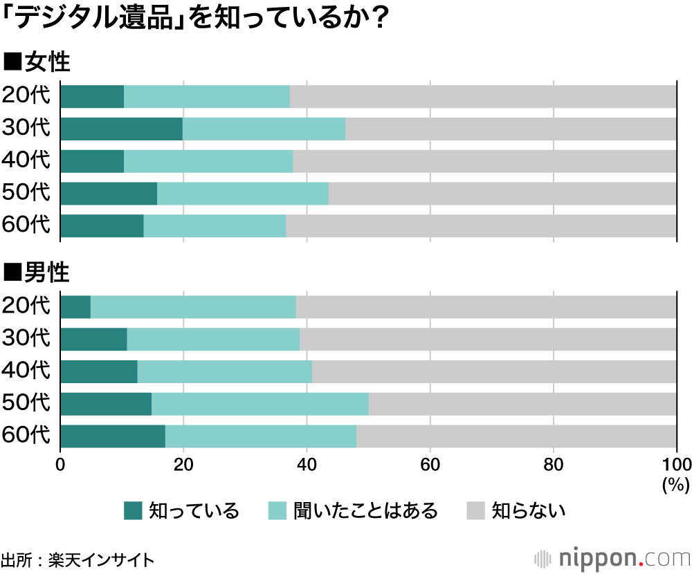 生前に利用していたPCやスマホに保存したデータや、SNSのアカウント、ネット銀行などウェブ上に保存されたデータなどの「デジタル遺品」についての認知度は、「知っている」「聞いたことはある」の合計が全体で41.8%。男性は、リアルに終活を意識する世代になるにつれ「知っている」の割合が高まっている。