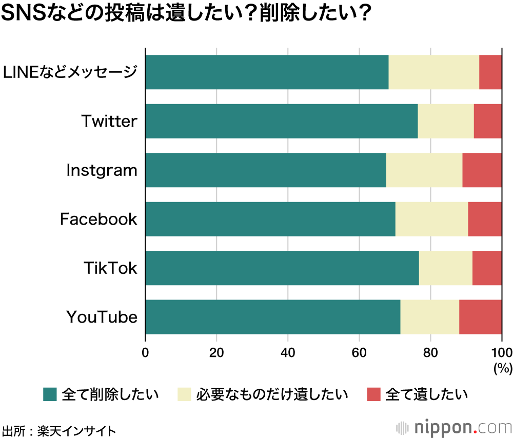 自身の死後、「デジタル遺品」であるメッセージアプリやSNSの投稿を遺したいか、削除したいか聞いたところ、いずれのサービスでも「全て削除したい」が7割程度だった。