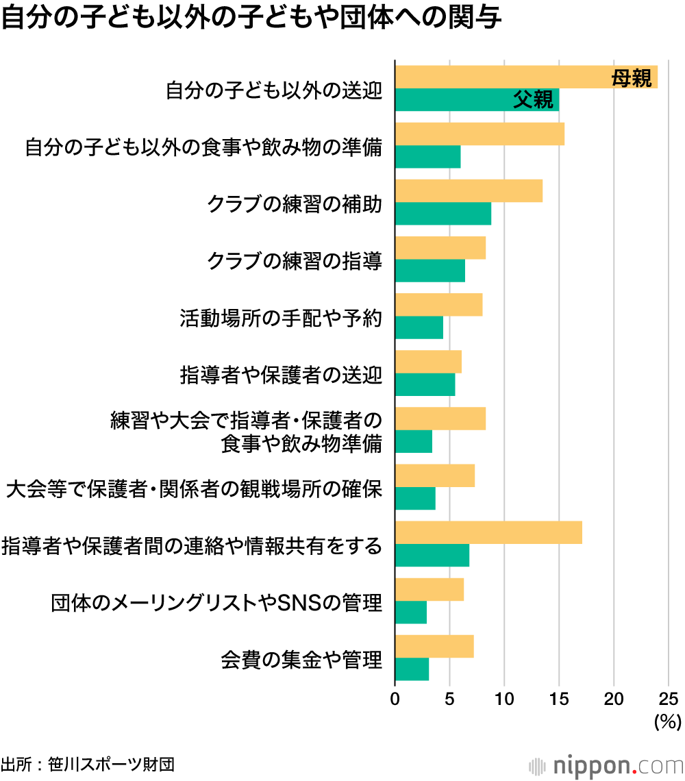 笹川スポーツ財団が実施した子どものスポーツ活動に対する保護者の関与の実態調査で、ママの献身なくして子どものスポーツ活動が成り立たないことが明らかになった。調査は2021年9月、小学生1~6年生の第一子を持つ母親2400人(各学年の男女の子ども各200人ずつ)を対象とした。