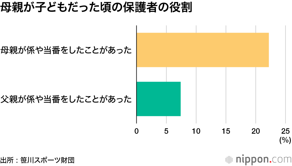 母親自身が子どもだった頃を振り返ってもらうと、親がスポーツ活動のチームなどの係や当番として関与していた度合いは、父親7.4%に対して、母親は22.2%と約3倍の開きがあった。祖父母の時代から、子供のスポーツ活動への関与は母親が中心という構造には変化がなく、性別役割が固定化しているようだ。