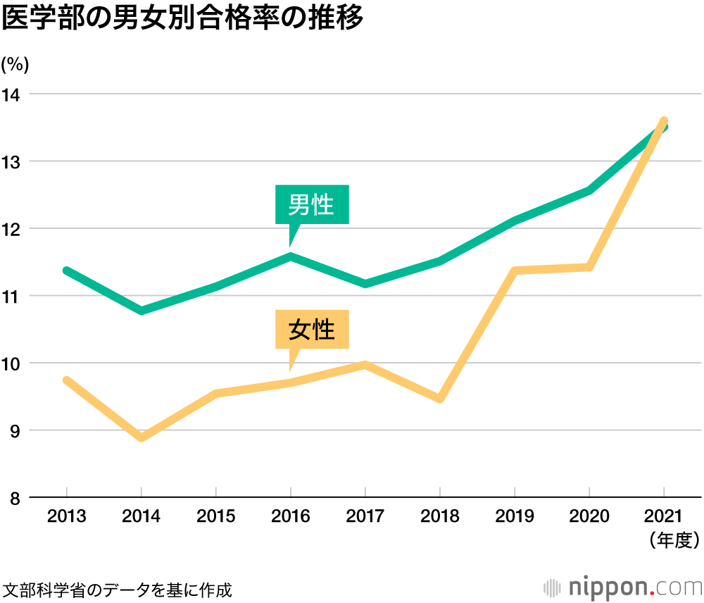 事件を受けて文科省がさかのぼって公表した13-18年度の6年分の全医学部の合格率は、男性11.25%、女性9.55%で、男性が1.7ポイント上回っていた。19年度以降は不正の是正が進んだためか、男女の合格率格差は狭まり、ついに逆転した。