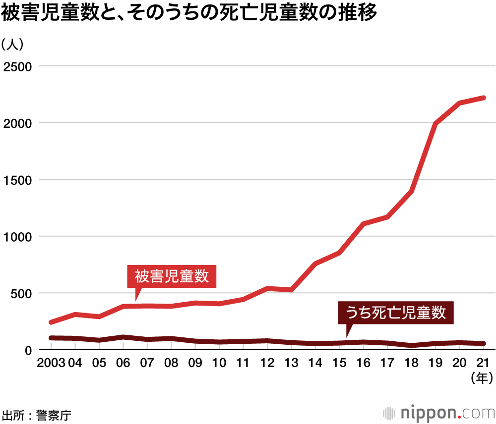 被害に遭った18歳未満の子どもは同2.2%増の2219人で過去最多。死亡した子どもは54人で、このうち29人が無理心中だった。