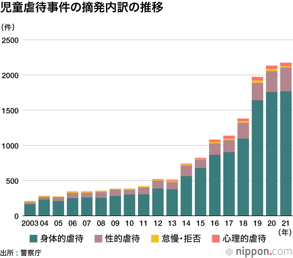 全国の警察が2021年間に検挙した児童虐待は前年比1.9%増の2174件で過去最多を更新した。社会的関心の高まりで第3者からの通報や相談が増えていることや、児童相談所との連携強化で警察が把握する虐待事案は増加基調にある。