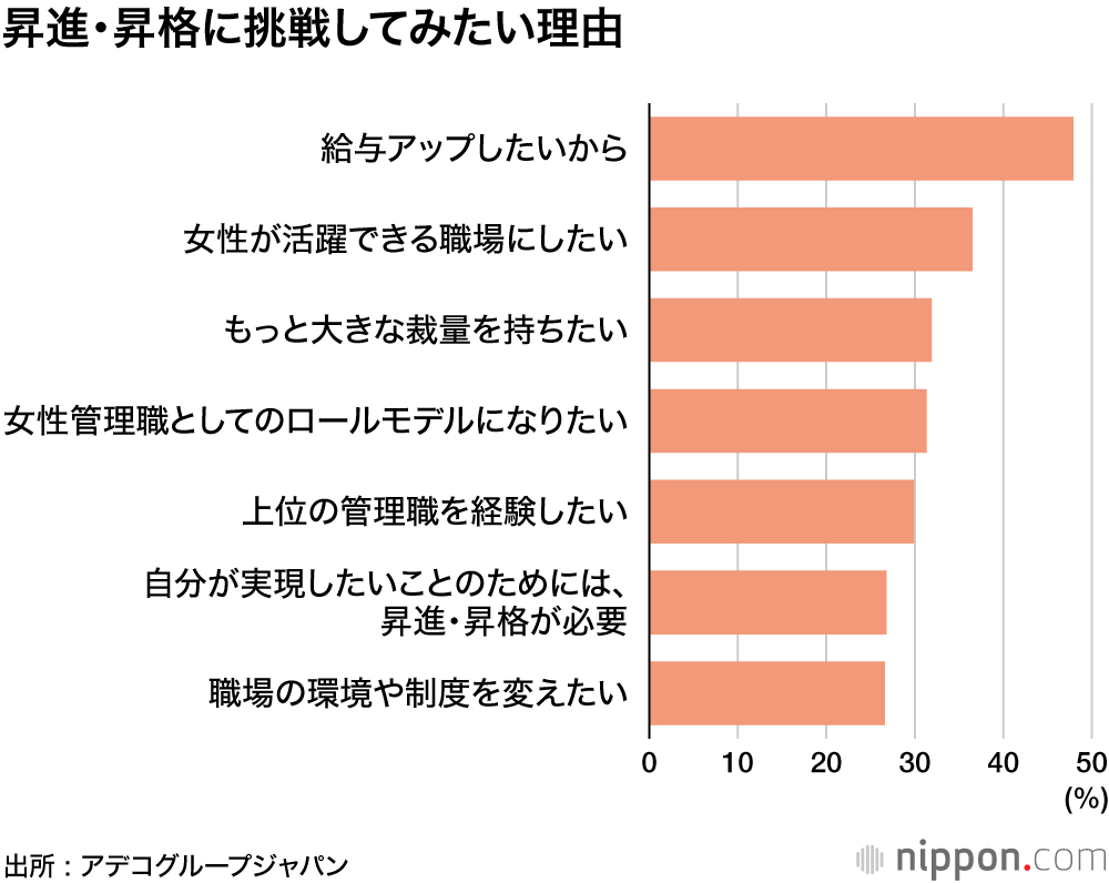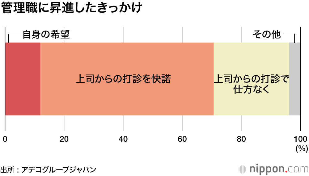 人材サービスのアデコグループジャパンが、課長職相当以上の管理職として働く女性1065人を対象に実施した意識調査で、自ら希望して管理職となった人は11.9%に過ぎず、さらなる昇進・昇格を希望する人は48.6%と半数を下回った。