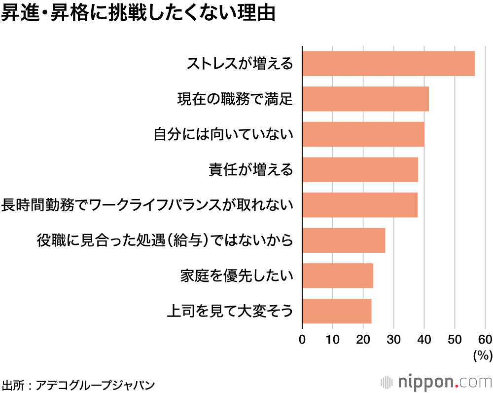 昇進・昇格に挑戦したくない理由としては「ストレスが増えるから」56.5%が断トツで多く、「現在の職務で満足」41.5%、「自分に向いていない」40.0%が続いた。