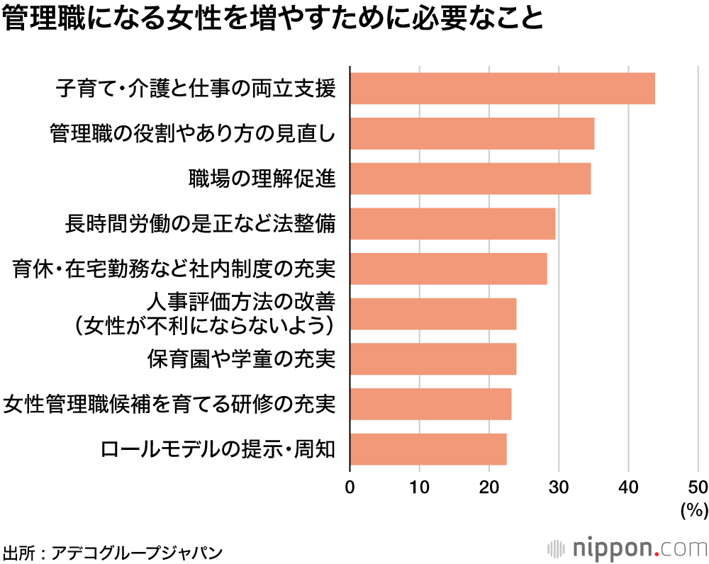女性管理職を増やすために必要なことを聞いたところ、「子育て・介護と仕事の両立支援」43.8%が最も多く、「管理職の役割やあり方の見直し」35.1%、「職場の理解促進」34.6%が続いた。