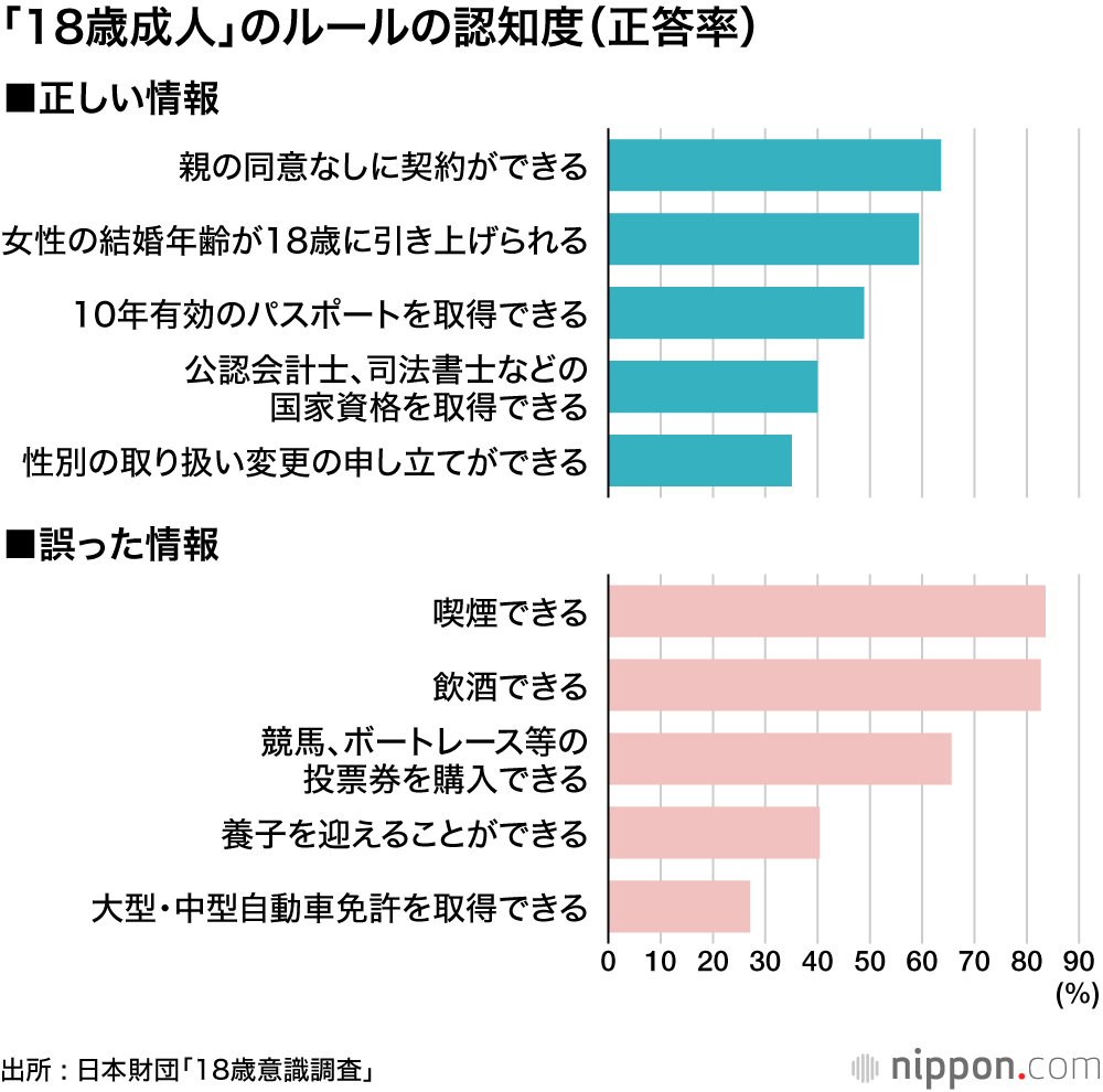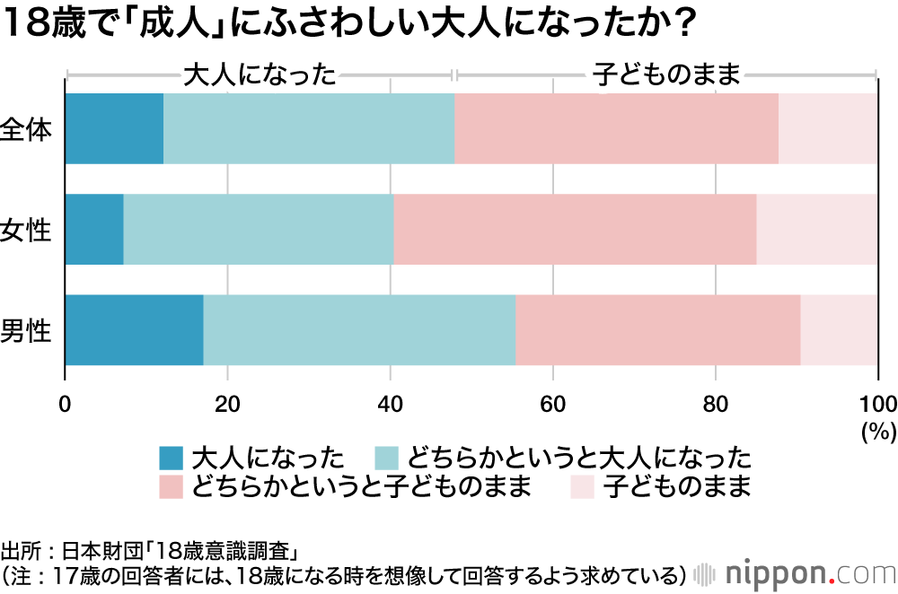 民法改正で2022年4月から「成人」になる年齢が20歳から18歳に引き下げられるが、日本財団が1月末に実施した「18歳意識調査」では、「成人」と呼ばれるにふさわしい大人になったと自覚があるのは全体の47.9%と半数以下にとどまった。特に女性は6割が「どちらかという子どものまま」「子どものまま」と回答した。