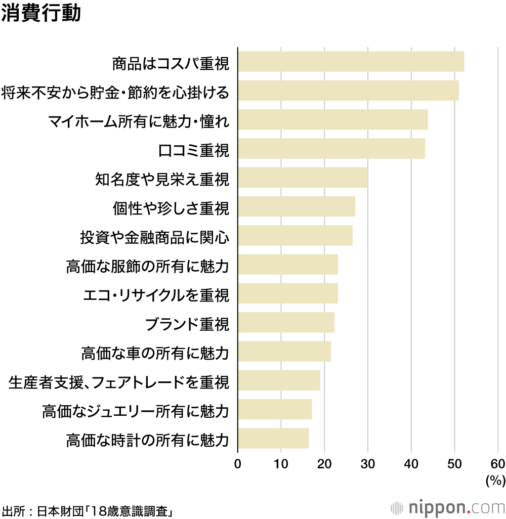 消費行動については「商品を選ぶ時にコストパフォーマンスを重視する」52.5%、「将来が不安なので貯金や節約を心掛けるつもり」51.0%など堅実志向が目立つ。デフレ経済の下に生まれ育った世代、ブランドや高級車、宝飾品への興味・憧れはそれほどないようだ。