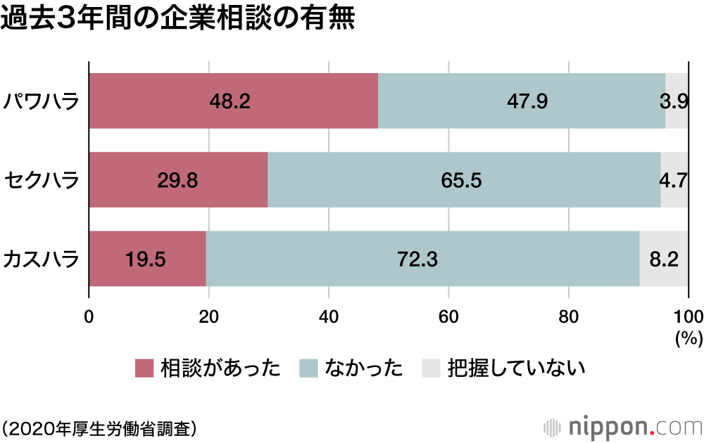 厚労省が実施した職場ハラスメントに関する調査によると、過去3年間に(職場や雇用者から)カスハラの相談が寄せられたと回答した企業は19.5%で、代表的な職場ハラスメントであるパワハラ(48.2%)、セクハラ(29.8%)に次いで多くなっている。