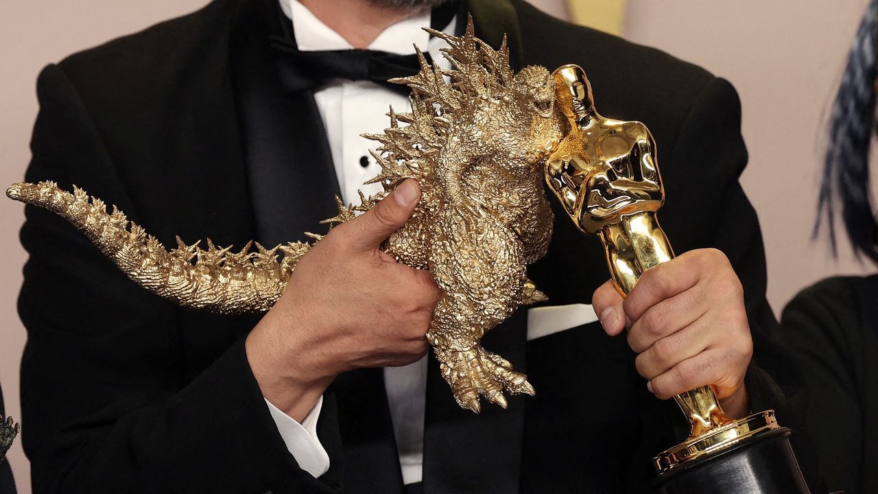 バナー写真 : 「ゴジラ-1.0」が視覚効果賞を受賞。山崎貴監督が両の手に握るオスカーとゴジラのフィギュア(ロイター)