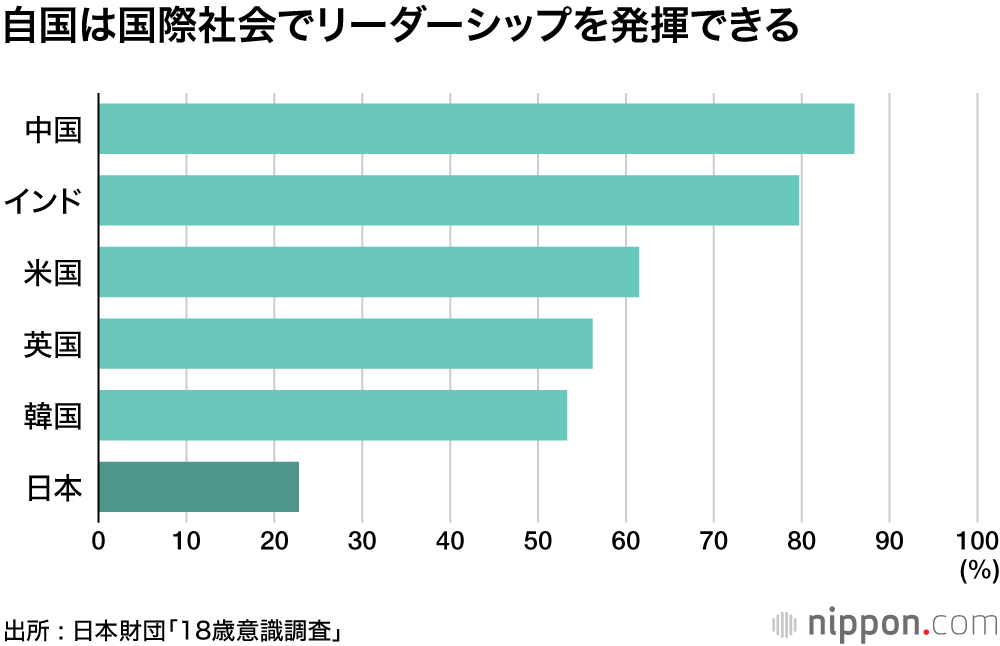 「自国は国際社会でリーダーシップを発揮できる」と答えたのは、日本ではわずか22.8%で、中国(86.0%)、インド(79.7%)の約4分の1にとどまる。米国(61.5%)、英国(56.2%)も、中印からは大きく水をあけられている。
