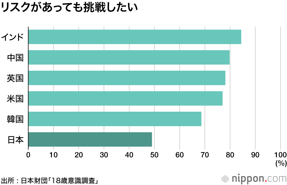 「リスクがあっても挑戦したい」人も、日本は49.0%と半数を割り込んだ。