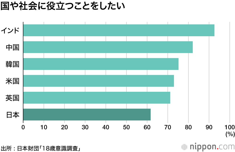 「国や社会に役立つことをしたい」と思う人は、日本では61.7%。トップのインド92.6%とは約30ポイントの開きがあった。