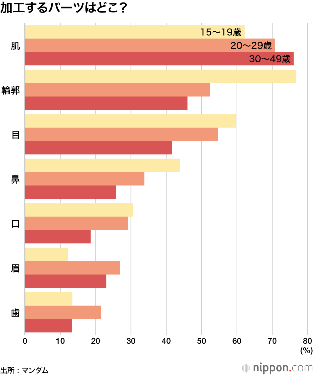 どのパーツを補正・加工するか聞いたところ、30~40代は「肌」76.1%、10代は「輪郭」76.8%が圧倒的に多かった。10代は「目」「鼻」も他の年代に比べて加工率が高く、細部にまでこだわって、自分の好みの顔を作り込んでいる。
