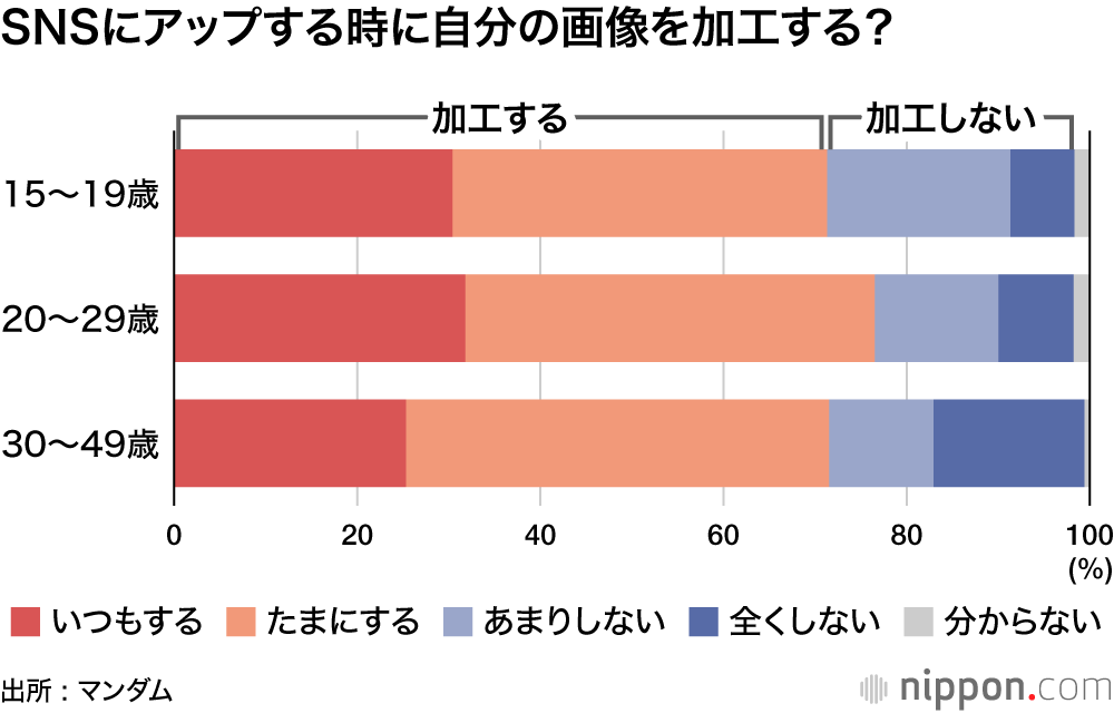 マンダムが15歳~49歳の女性443人を対象に2022年3月に実施した調査で、SNSにアップする際に自分の画像を加工するかどうかを聞いたところ、どの年齢層も「いつもする」「たまにする」の合計が7割を超えた。今や、加工しない素の自分をさらすのは少数派のようだ。