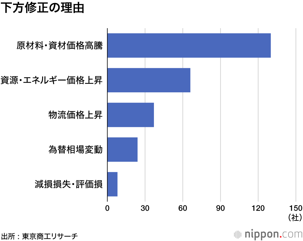 下方修正の理由は「原材料・資材価格高騰」が130社と全体の7割を占め、資源・エネルギー価格上昇66社が続いた。