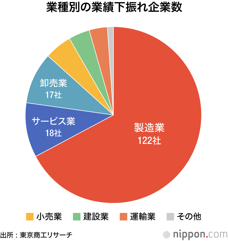 業種別では製造業が122社で、全体の7割近くを占めた。大手電力会社、ガス会社がエネルギー価格の上昇を吸収できずに損失を広げたことなどでサービス業が18社だった。
