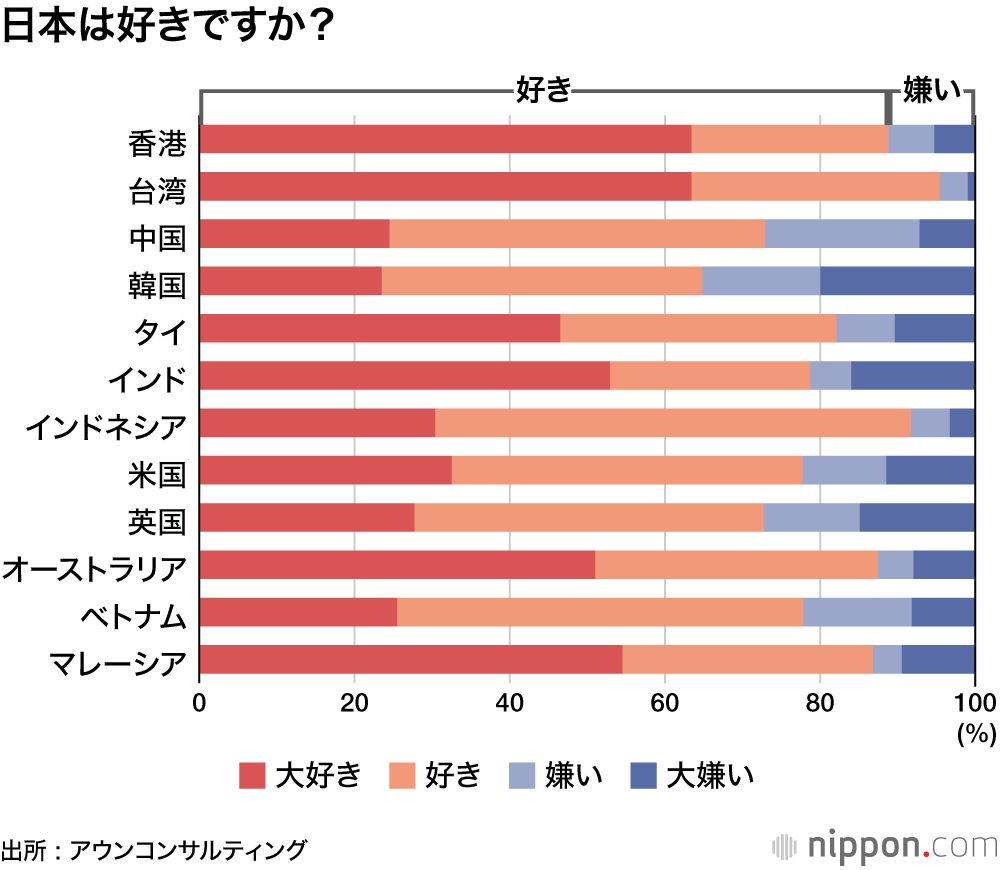 日本への好感度(「大好き」「好き」の合計)が最も高かったのかは台湾の95.4%で、インドネシア91.7%、香港88.8%が続いた。2021年に実施した調査と比べて、全体的に好感度は低下しており、特に英国は前年より16.5%、米国は15.1%のマイナスだった。
