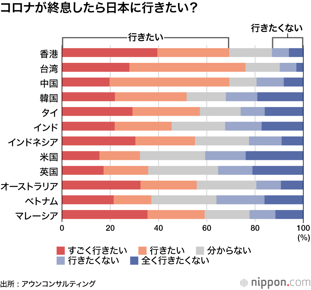 「新型コロナウイルス感染症が終息したら日本に行きたいか」を聞いたところ、コロナ禍前に訪日者数が多かった、中国、台湾、香港は「すごく行きたい」「行きたい」の回答が多かった。一方、韓国は「行きたくない」「まったく行きたくない」の合計が3割を超えた。