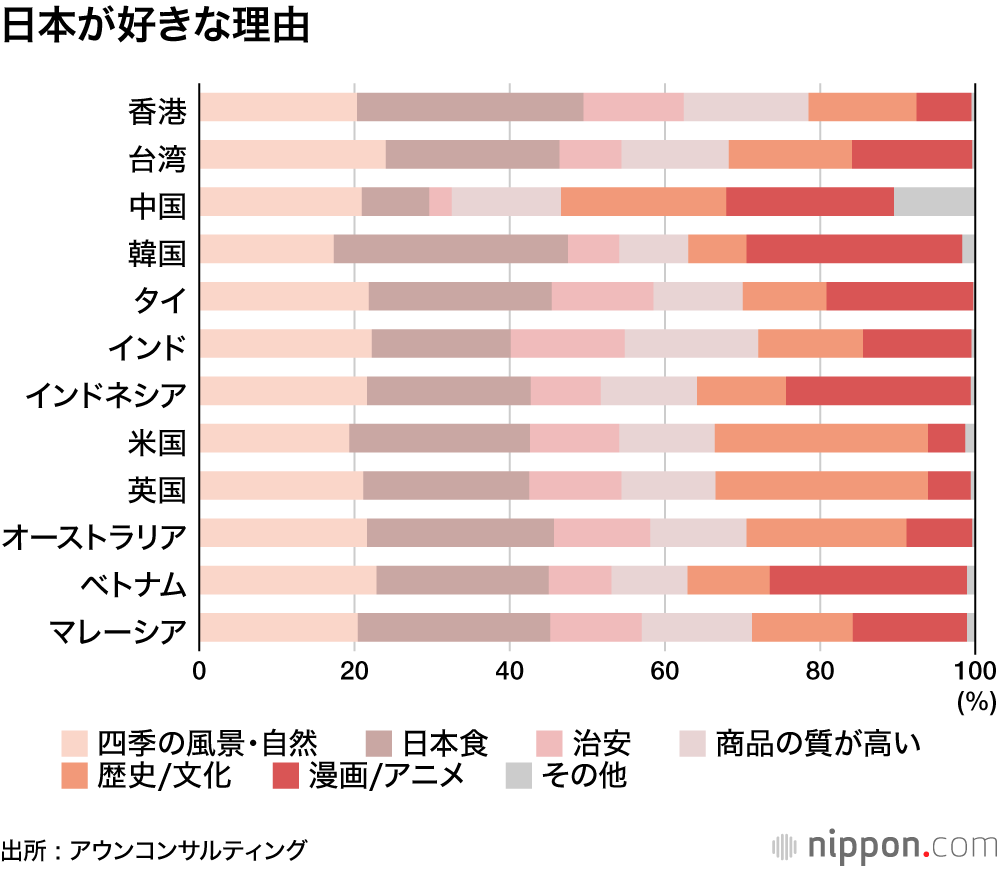 日本の好感度について、「大好き」「好き」と回答した人に理由を聞いたところ、「四季の風景・自然」「日本食」の割合が全体的に高かった。米国・英国は「歴史/文化」の割合がそれぞれ27%と高い一方で、アジア諸国と比べると「漫画/アニメ」の割合が低い。