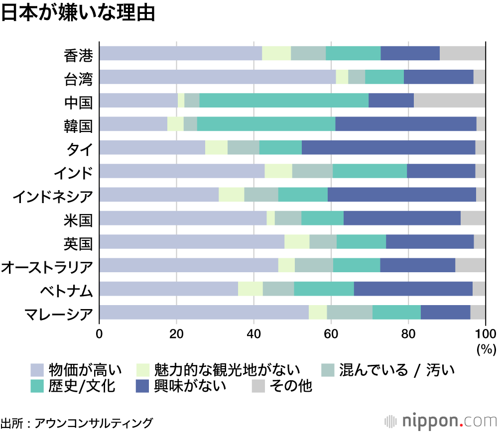日本が嫌いな理由については、全体的に「物価が高い」の割合が高く、特に台湾は61.2%。中国と韓国は「歴史/文化」を挙げる人が多く、韓国、タイ、インドネシアはそもそも「興味がない」人も多かった。
