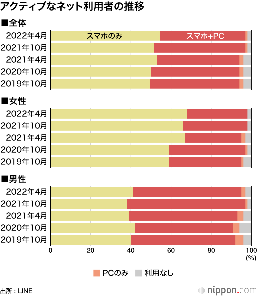 LINEが2016年から半期ごとに実施しているインターネット利用環境調調査で、「スマートフォン(スマホ)のみ」利用者は増加傾向にあり、2022年4月調査では54%と前回調査(52%)より微増した。「スマホとPC」の併用は42%。