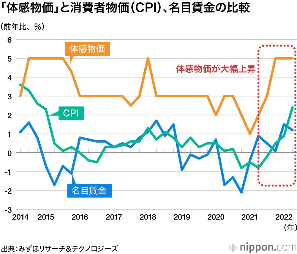 さらに日銀の「生活意識に関するアンケート調査」を基に、同社が物価の「肌感覚」を数値化した「体感物価」は2022年に入り、急上昇。その半面、名目賃金は伸び悩み、両者の格差は大きく開いている。